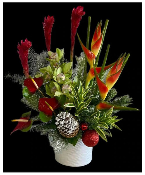A beautiful Tropical arrangement with accents of Christmas greens and ornaments