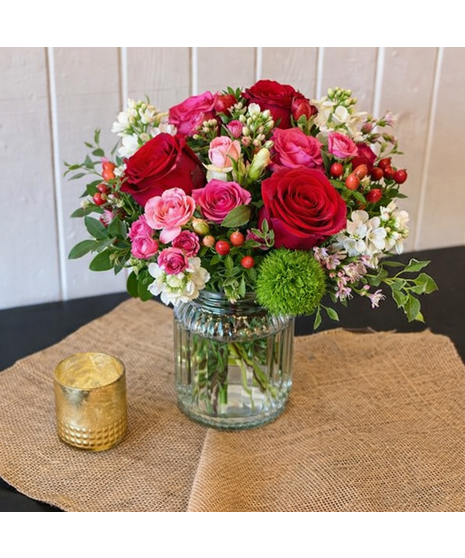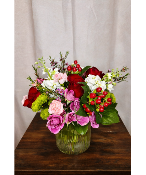 Raspberry Jam Jar is a joyful burst of color featuring red roses, hot pink spray roses, light pink mini carnations, white stock, green ball dianthus, red hypericum, and pink waxflower, beautifully arranged with fresh greens in a charming cylinder vase. A perfect pick-me-up gift for any occasion.