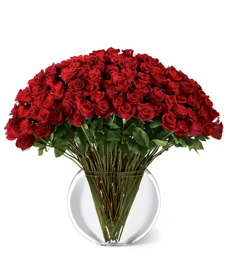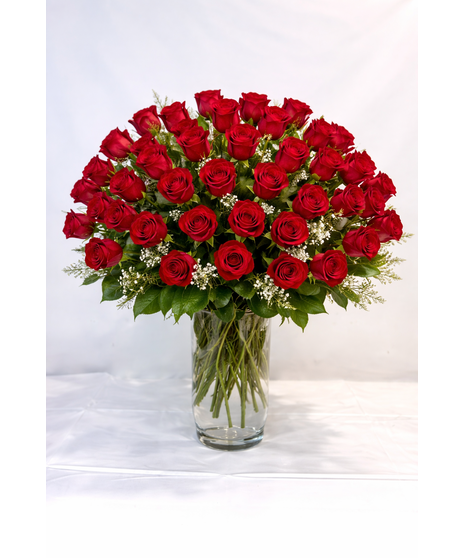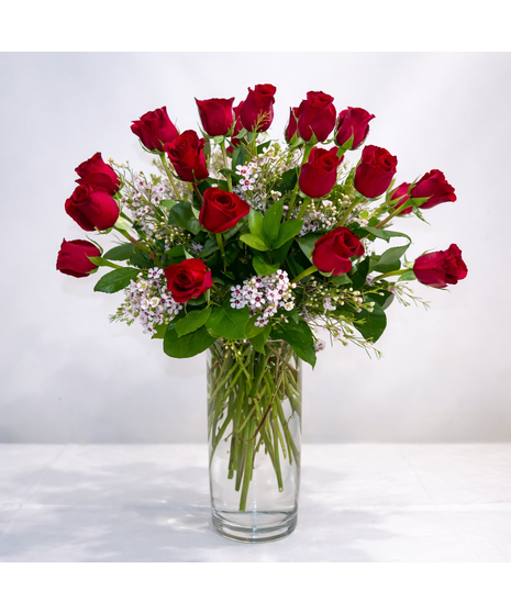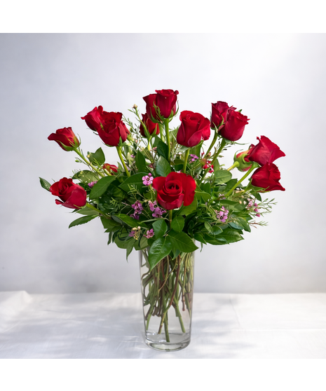 The classic elegance of red roses is beautifully showcased in this timeless arrangement. Presented in a sleek glass vase, these velvety red roses are paired with lush greens and delicate filler flowers, creating a stunning display of love and admiration perfect for any occasion. Chose from one dozen, two dozen, and three dozen.