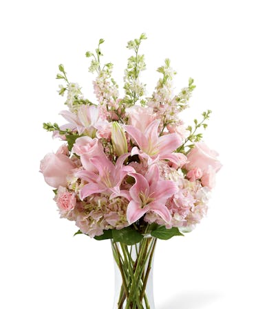 Wishes & Blessings Bouquet is a stunning way to offer your condolences for their loss and commemorate the life of the deceased. Soft pink roses, spray roses, Oriental lilies, hydrangea and larkspur are brought together in a clear glass vase to create an eye-catching display of soft serenity.